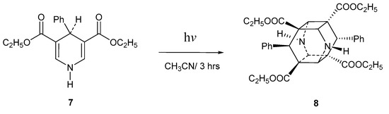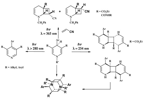 Most photolytic reactions of 1,4-dihydropyridine (DHP) take place with elimination of molecular hydrogen followed by dimerization or aromatization products [7,8,9]. Moreover, Ponticelli reported that [10,11,12,13] photocycloaddition of acrylonitrile to 1-benzyl-1,4-dihydropyridine dicarboxylate derivatives afforded two diastereomeric azabicyclo[4.2.0]octane derivatives. Using Z or E-but-2-enenitrile in this photocycloaddition reaction gave products retaining the original alkene stereochemistry, thus proving the concerted nature of this [2 + 2] cycloaddition [13]. Also, 1,4-dihydropyridine dicarboxylate derivatives have been reported to undergo head-to-tail [2 + 2] photodimerization to give anti- and syn-dimers, and a cage dimer (formed by further intramolecular [2 + 2] photodimerization of the syn-dimer) (Scheme 1) [14,15,16,17].