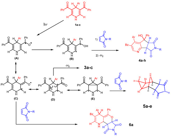 The formation of the different photo-adducts 4a–h, 5a–e, and 6a can be satisfactorily interpreted by the formation of the diradical intermediates A–D. Diradical A, which is formed from the initial excitation of the (n, π*), undergoes a hydrogen shift from the β-carbon to form diradical B, which then undergoes cycloaddition with 2 followed by dehydrogenation to give 4. Diradical A can also resonate to diradicals C, D and E. Trapping of the diradical C with 2a yields 6a, diradical C which is in resonance with D may also go through loss of H2 to give the pyridine derivatives 3a–c. Finally, trapping of diradical E with the appropriate maleimide gives the corresponding interesting tetracyclic system 5 (Scheme 3).