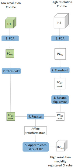 - The higher resolution PC mask image was rotated and flipped to match the orientation of the lower resolution one. This was followed by down-sampling of the higher resolution image to the approximate size of the lower resolution image, resulting in a PC score mask image for the 2nd modality (PCH2r) with similar orientation and size to that of the 1st modality (PCH1). Images were down-sampled using the “imresize” function of the Matlab image processing toolbox [10]. This function works by resizing a two dimensional image to a target size using bicubic interpolation.