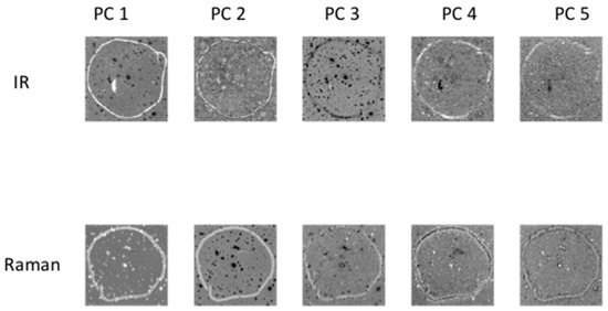 PCA applied to chemical image cubes from different modalities (image set 1): First five IR and Raman PC score images are shown. The main salient feature used for registration was the loop feature, which is seen in IR PC 1 and in Raman PC 2 as a bright loop. All images were scaled to the range mean ± 4 standard deviations.