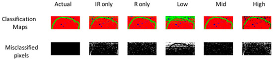 In order to achieve high level fusion, the classification maps resulting from PLS-DA applied separately to each modality were merged by consensus—i.e., pixels classified as belonging to the same class in each class prediction map were assigned to that class in the high-level fused map, while pixels classified as belonging to different classes were classified as unknown. The consensus map suffers from the presence of several unclassified pixels, corresponding to those pixels where different classes were predicted from IR and Raman data. Consequently, for image set 1 the high level fused data resulted in the lowest classification accuracy when compared to IR only, Raman only, low and mid-level fused data (91.4% versus 91.1%, 93.7%, 75.8% and 96.8% respectively). Similar trends were observed for image set 2 (see Table S1).