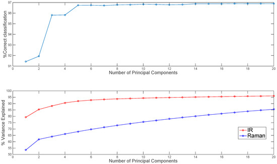 Effect of number of IR and Raman principal components used in mid-level fusion on % correct classification for image set 1 (top panel). Percentage variance explained by each number of PCs shown in lower panel.