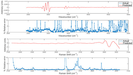 Error estimation for prediction of each wavenumber in image set 1. Top two panels show (upper panel) mean actual and predicted spectrum and (lower panel) % relative error at each wavenumber for prediction of IR from Raman chemical image data. Bottom two panels show (upper panel) mean actual and predicted spectrum and (lower panel) % relative error at each wavenumber for prediction of Raman from IR chemical image data.