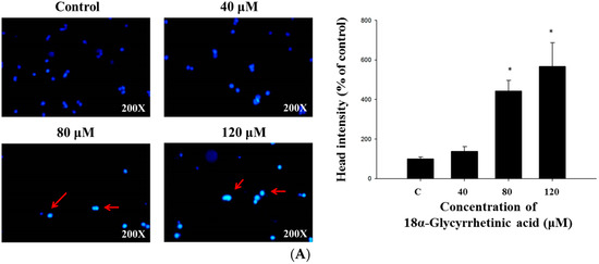 Cells were placed in 6-well plate at a density of 2 × 105 cells/well and cells were incubated with 18α-GA ranging from 40–120 μM for 48 h. After treatment, cells from each treatment were harvested to examine the DNA damage with the Comet assay as described previously [45].