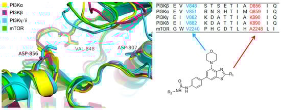 (Left): structure superimposed of PI3Kα, β, γ, δ and mTOR. Red: PI3Kβ (4BFR), yellow: PI3Kα (3ZIM), blue: PI3Kγ (5EDS) or PI3Kδ (4GB9), green: mTOR (4JT6); (Right): part of the sequence alignment of PI3Ks and mTOR, and the corresponding docking position in newly designed compounds.