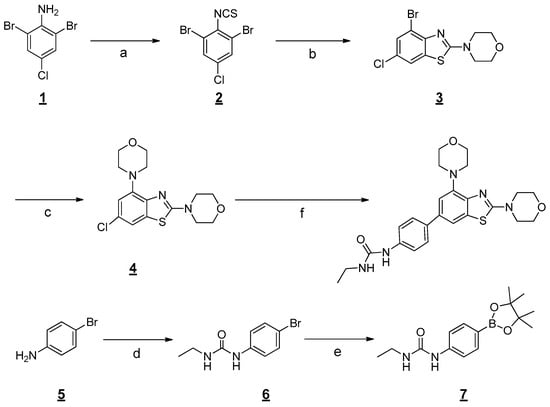 Synthesis route of compound 1. Reactions and conditions: (a) Thiophosgene, 4-dimethylaminopyridine (DMAP), CH2Cl2, 40 °C, 6–8 h, 95%; (b) 1. Morpholine, dioxane, 25 °C, 0.5 h; 2. DMAP, CsCO3, dioxane, 105 °C, 3 h, 92%; (c) Morpholine, Pd2(dba)3, CsCO3, (R)-(+)-2,2′-Bis(diphenylphosphino)-1,1′-binaphthalene (R-BINAP), DMF, 90 °C, 8 h, 82%; (d) Isocyanatoethane, CH2Cl2, 40 °C, 0.5 h, 96%; (e) Bis(pinacolato)diboron, Pd2(dba)3, K2CO3, 85 °C, 6 h, 72%; (f) 7, Pd(PPh3)4, K2CO3, 80 °C, 3 h, 77%.
