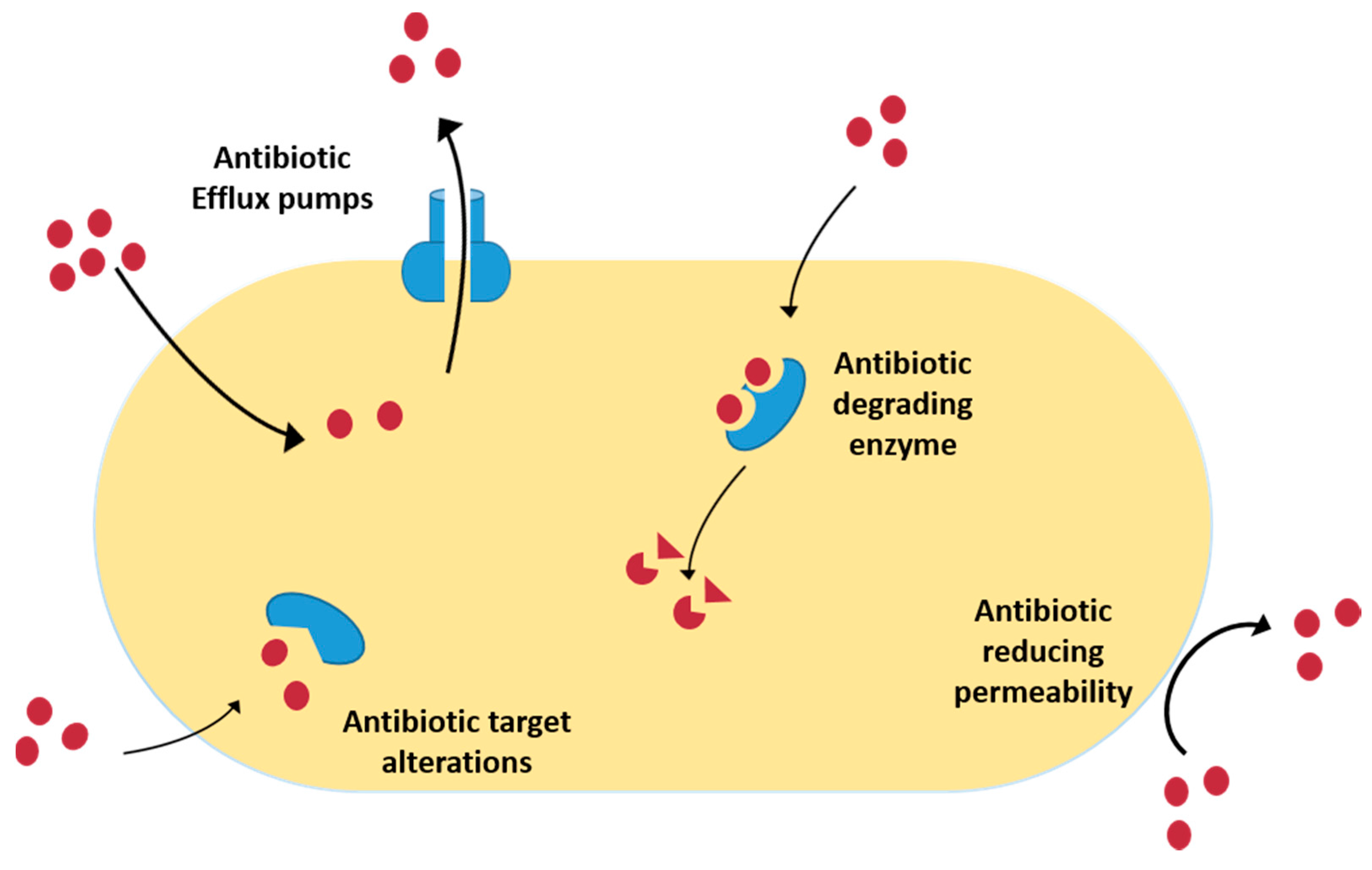 Susceptible bacteria may become resistant to antibiotics through multiple and complex mechanisms, such as prevention of access to the target by reducing permeability, increased efflux pumps (EPs) expression, degradation/modification of the antibiotics, and modification of the molecular target (Figure 1) [1]. More detailed information about all of them will be presented below.