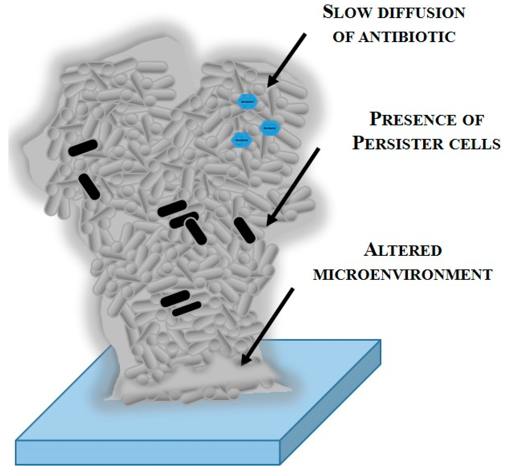 It is becoming increasingly clear that cells in biofilms are more resistant to antibiotics, biocides and other chemical or physical challenges compared to the same cells in planktonic state [58,62,63,64]. The development of antibiotic resistance is not well known, but recent studies have developed a variety of model systems to understand how and why biofilms are more resistant to antibiotics [63].
