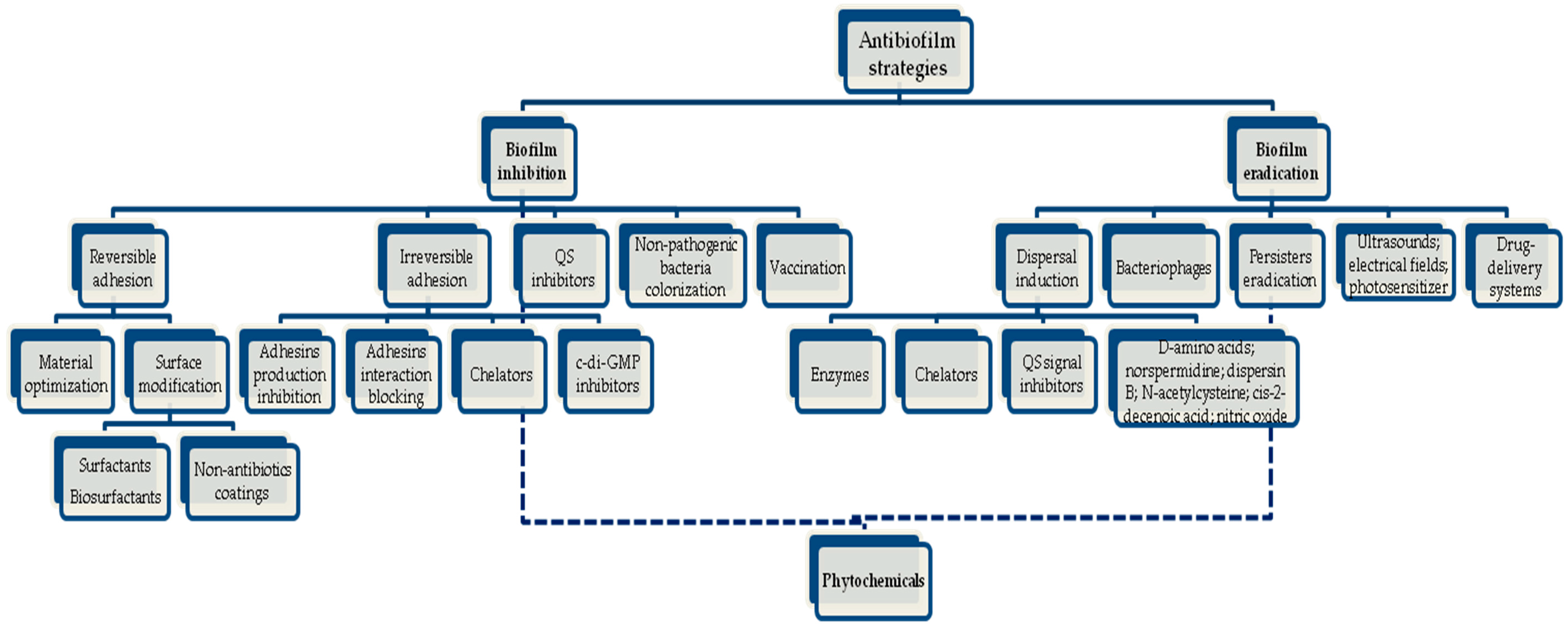 The concern in developing antimicrobials with improved efficacy against pathogenic bacteria that are highly resistant to antibiotics and host immunity has been mainly directed at planktonic bacteria without taking into account the specificities of the sessile lifestyle [130]. However, there is no doubt that new sources of antimicrobials and strategies promoting effective biofilm inhibition and/or eradication are crucial. Through the years, several strategies have been proposed, but they have not been sufficiently powerful and additional therapeutic solutions continue to be needed [131]. During the search for novel drugs and alternative approaches for the treatment of biofilm-related infections, it is helpful to identify factors that impair biofilm formation or disturb its structure, based on both physical and biological characteristics. In this way, targeting the different stages of biofilm development (e.g., adhesion, motility, production of extracellular polymeric substances (EPS) and QS phenomena) and inducing biofilm inactivation and removal by means of weakening, dispersion or disruption can be a promising strategy [130,132,133]. Current investigations are increasingly focusing on the discovery of compounds and techniques that are able to change the phenotype of the bacteria without inducing modification at the genetic level, thus avoiding selective pressure, which otherwise could lead to the development of resistance [134]. Diverse novel strategies to deal with unwanted biofilms have already been identified [135,136,137,138,139,140] (Figure 3).