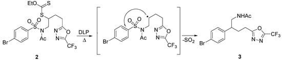 Another example of Smiles rearrangement, triggered by generation of the radical from a xanthate with dilauroyl peroxide (DLP) was proposed by Zard, as illustrated by Scheme 3. Sulfonamide 2 furnished the corresponding trifluoromethylated oxadiazole 3 in 32% yield [21].