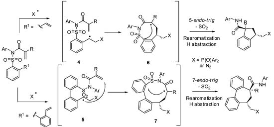 When ortho-vinyl- or ortho-styryl-substituted N-(arylsulfonyl)arylamide substrates were reacted with carbon or heteroatom centered radicals a multistep radical domino process takes place to afford multifunctionalized indane- and dibenzocycloheptadiene-type products in a stereoselective manner (trans relative configuration between amide and phosphonyl or azide functions) [23]. According to the proposed mechanism (Scheme 5) primary radicals react with the vinyl moiety to give benzyl radicals 4 or 5 that undergo 8-endo- or 10-endo-trig cyclization. With the obtained α-keto radicals (6 or 7) a second 5- (or 7-membered) ipso-cyclization occurs provoking a subsequent 1,4-aryl group migration—desulfonylation—rearomatization—H-abstraction process, as part of a Smiles rearrangement.