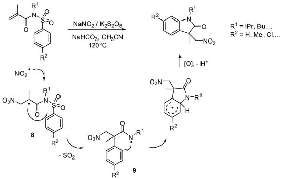 Nitromethyl-substituted oxindole derivatives could be obtained via a radical cascade process involving substitution—desulfonylation—cyclization steps in a one-pot procedure without using toxic metal catalysts. The procedure used NaNO2 as a nitro source and potassium peroxydisulfate as an oxydant (Scheme 7). According to the mechanism proposed by Zhou and coworkers, the reaction starts with the formation of a nitrogen dioxide radical that adds to N-alkyl-N-(phenylsulfonyl)acrylamide resulting in the intermediate 8. Smiles rearrangement generates intermediates 9 that give oxindole derivatives in good yields. The obtained nitromethyl-substituted oxindoles are valuable structures for further synthetic applications [25].