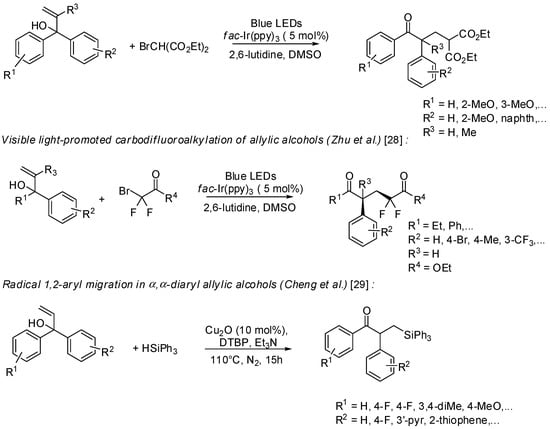 - Huang, H.-L.; Yan, H.; Yang, C.; Xia, W. Visible light-mediated arylalkylation of allylic alcohols through concomitant 1,2-aryl migration. Chem. Commun. 2015, 51, 4910–4913. [Google Scholar] [CrossRef] [PubMed]