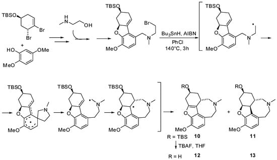 - Lan, P.; Jackson, C.J.; Banwell, M.G.; Willis, A.C. Synthesis of a D-ring isomer of galanthamine via a radical-based Smiles rearrangement reaction. J. Org. Chem. 2014, 79, 6759–6764. [Google Scholar] [CrossRef] [PubMed]