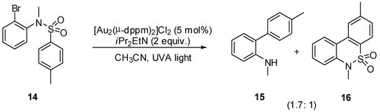 As part of a study to explore new transition-metal complexes as potential photocatalysts Barriault et al. have described a light-induced reductive radical reaction of unactivated alkyl and aryl bromides using a dimeric phosphine-gold complex. Scope and limitation experiments demonstrated the potential of the catalyst both in intra- and intermolecular transformations. As expected, among the screened substrates sulfonamide 14 afforded mainly the biaryl amine 15 by ipso-substitution along with the tricyclic sulfonamide 16 in 93% overall yield (Scheme 12) [32].