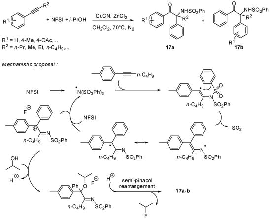 Recently, Zhang reported a radical cascade process between alkynes, N-fluoroarylsulfonimides and simple alcohols enabling the efficient synthesis of α-amino-α-aryl ketones 17. This process combines four subsequent reactions: the vinyl radical formation from N-fluorobenzenesulfonimide, (NFSI), followed by the aryl group migration, an efficient desulfonylation and a final semi-pinacol rearrangement (Scheme 15) [38].