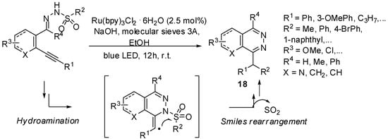 Visible light Ru(II)-photoredox catalysis has been used by Belmont and coll. in a radical cascade hydroamination—Smiles rearrangement process for the synthesis of various phthalazine derivatives 18 (Scheme 16) [39]. The mild reaction conditions combined with an excellent functional group tolerance make this approach particularly attractive to reach a high molecular diversity. In addition, halogenoaryl substituents are well tolerated allowing subsequent transition metal-catalyzed functionalizations.