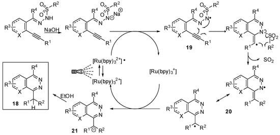 Mechanistic investigations (Scheme 17) revealed a sodium hydroxide-mediated deprotonation and photooxidation as initial steps to give an N-centered radical 19. Addition of this latter to the triple bond and SO2 extrusion led to the phthalazine radical 20. The diarylmethyl anion 21 obtained by reduction of 20 was protonated (or deuterated in CD3OD) to afford the final product 18.