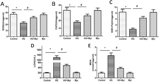 2.2. Myricitrin Decreased Oxidants and Increased Antioxidants in H9c2 Cells Exposed to HG
