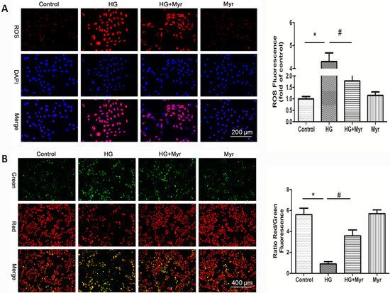 2.3. Myricitrin Suppresses HG-Induced Mitochondrial Superoxide (ROS) Production and Reduced MMP in H9c2 Cells