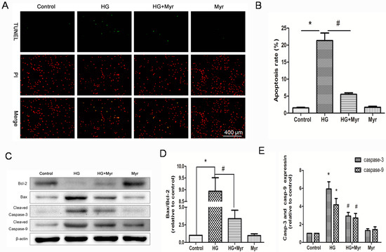 2.4. Myricitrin Attenuates HG-Induced Cell Apoptosis in H9c2 Cells