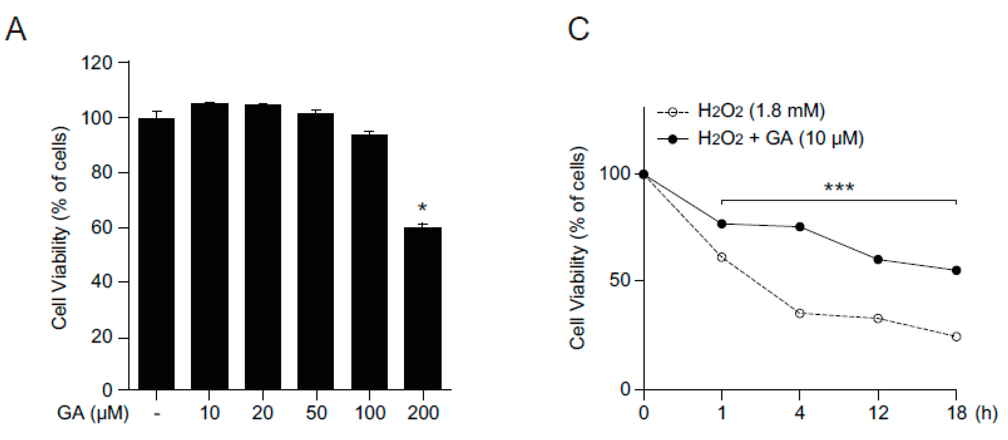 2.1. GA Protects Skin Cells from Oxidative Stress