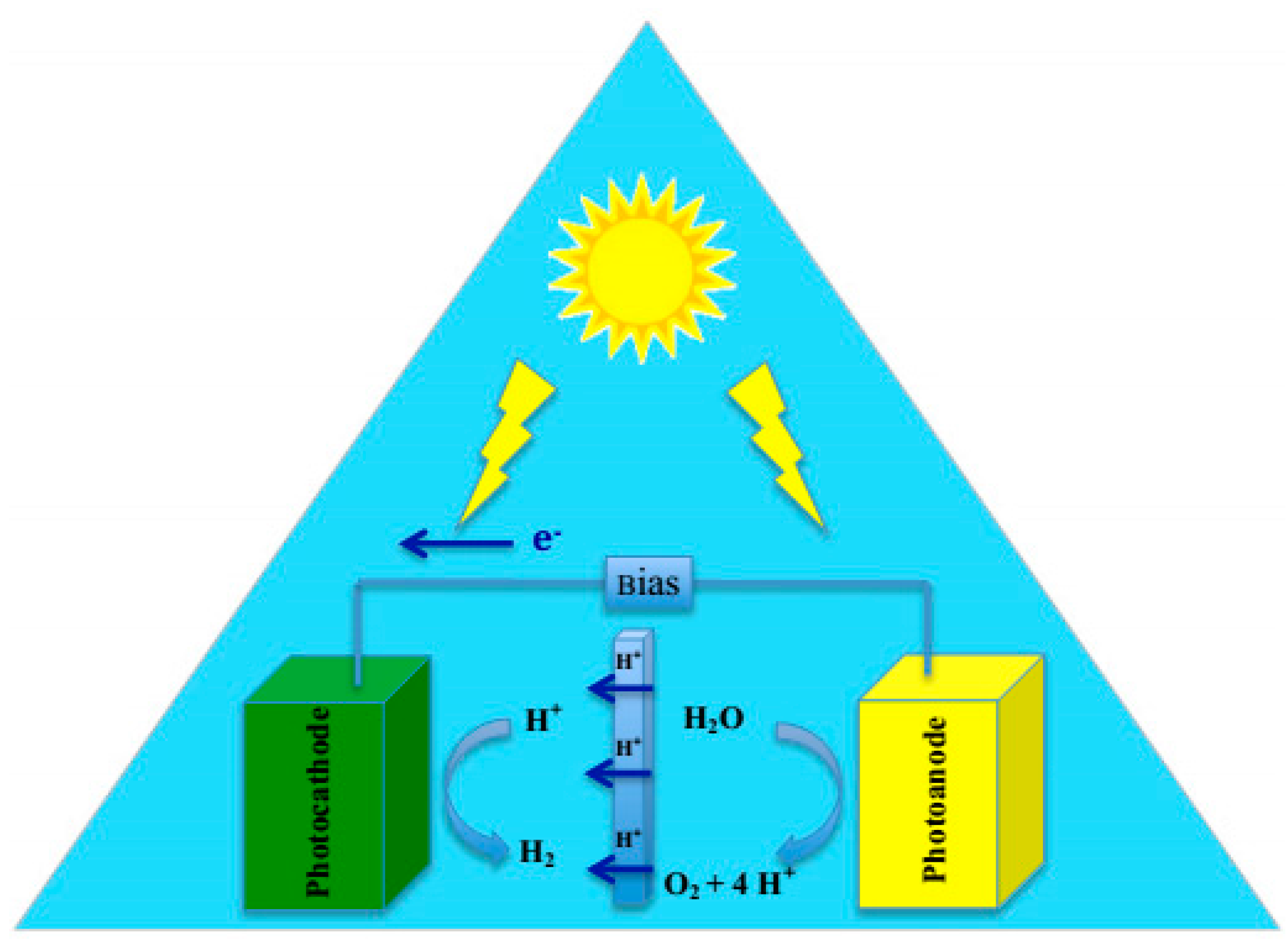 In photoelectrochemical (PEC) water splitting, a photocatalyst, which is a semiconductor, is irradiated by UV-visible light with energy greater or equivalent to the band gap of the semiconductor (Figure 2). The light energy will be absorbed by the photocatalyst and results in charge separation at the valence band and conduction band. The holes are produced at the valence band, and the photo-excited electrons are located in the conduction band. The holes trigger the oxidation of water at the surface of conduction band while the photo-excited electrons at conduction band reduce the absorbed H+ to H2. Mainly in photoelectrochemical water splitting, semiconductors are applied as a photocathode or photo-anode depending on the reaction, which is favored. In photo-electrochemical water splitting, a semiconductor electrode should be in contact with an electrolyte, which contains a redox couple. In PEC water splitting, the overall reaction takes place at two different electrodes. In this method, the potential which is needed for water splitting is being provided by illuminating the cathode or anode [91].