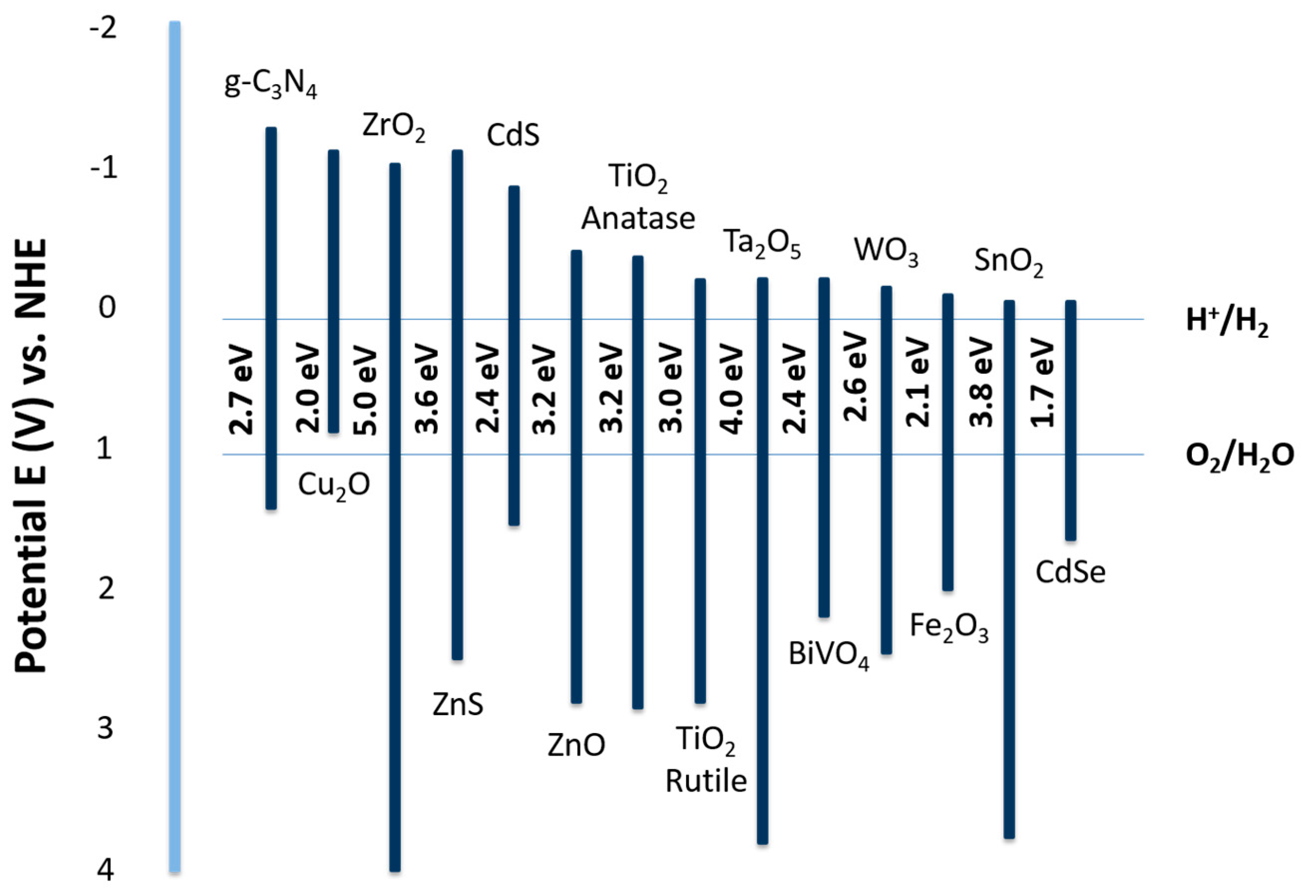 Therefore, the minimum band gap for a suitable water splitting photocatalyst should be 1.23 eV. Accordingly, TiO2, ZrO2, KTaO3, SrTiO3, and BiVO4 are good candidates for photocatalytic water splitting [36,37,38] However, some typical semiconductors such as SiC, ZnO, and CdS, even though their band gap fits well into the water splitting redox potential, are not active for water splitting due to photocorrosion. Photo-corrosion happens when the anion from the catalyst itself is oxidized by photogenerated holes instead of water. Another challenge is that most semiconductor catalysts only operate under ultraviolet (UV) light which accounts for only ca. 4% of the total solar energy [32,33,34]. To improve the solar energy efficiency, photocatalysts with the ability to work under visible light are highly desirable, since visible light contributes to almost half of the incoming solar energy. The band gap of semiconductor materials should be less than 3 eV to have a visible light response. Recently, semiconductor catalysts coupled with carbon materials or precious metal particles have been shown to have better visible light response [35,36]. In addition, metal sulfides, metal nitrides, and metal-free catalysts are also promising catalytic systems for photocatalytic water splitting by visible light [37,38,39,40].