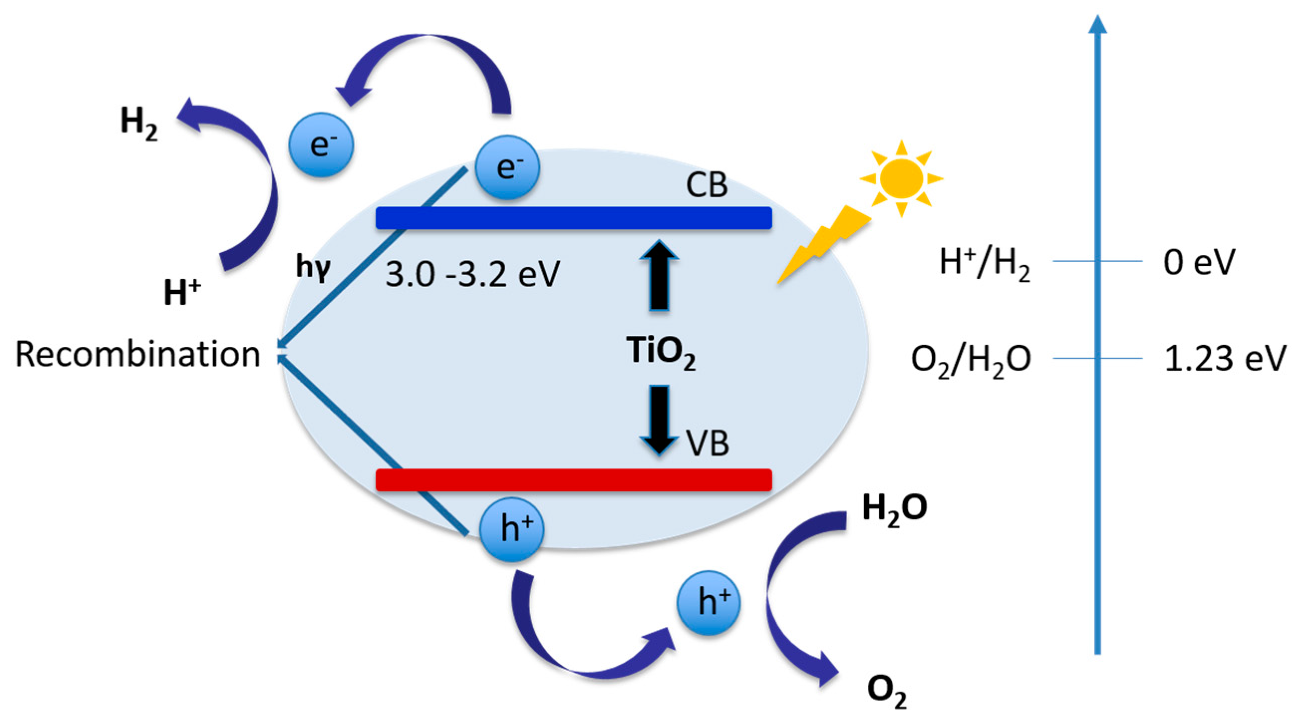 Fujishima and Honda first reported the overall photocatalytic water splitting by a titanium dioxide (TiO2) electrode [35]. Since this pioneering work, numerous research studies of water splitting have been conducted on semiconductor materials, especially via heterogeneous catalysis. Semiconductors have non-overlapping valence bands and conduction bands with a band gap in between that of insulators and conductors. When sufficient photochemical energy is applied, electrons will be excited into the conduction band, leaving electron holes in the valence band and excess electrons in the conduction band. These electron-hole pairs play key roles in the redox reactions of water splitting. Electrons are responsible for reducing protons to hydrogen molecules, and oxygen anions will be oxidized by the holes. In order to initiate the redox reaction, the highest level of the valence band should be more positive than water oxidation level (, 1.23 V vs. Normal hydrogen electrode; NHE), while the lowest level of the conduction band should be more negative than the hydrogen evolution potential (, 0 V vs. NHE).