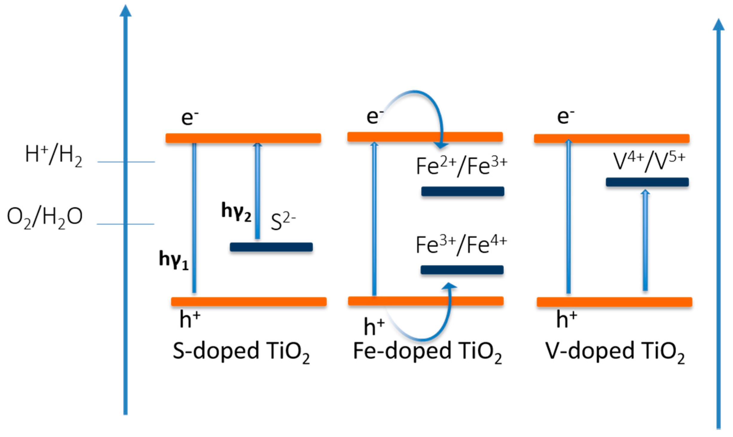 Unlike non-metal ion doping, metallic dopants usually introduce additional energetic levels in the band gap, which reduce the energy barrier and induce a new optical absorption edge [158,159]. Piskunov et al. [152] have reported enhancement in photocatalytic water splitting activity of Fe-doped TiO2, where Fe2+/Fe3+ acts as electron-trap centers and Fe3+/Fe4+ acts as hole-trap centers. Luo et al. [97] have shown at vanadium doping shifts the absorption band to the visible region and the V4+/V5+ pair efficiently traps the electrons and holes, which suppress the recombination of electron and holes. Figure 5 represents the schematic band alignment of doped TiO2 semiconductors.