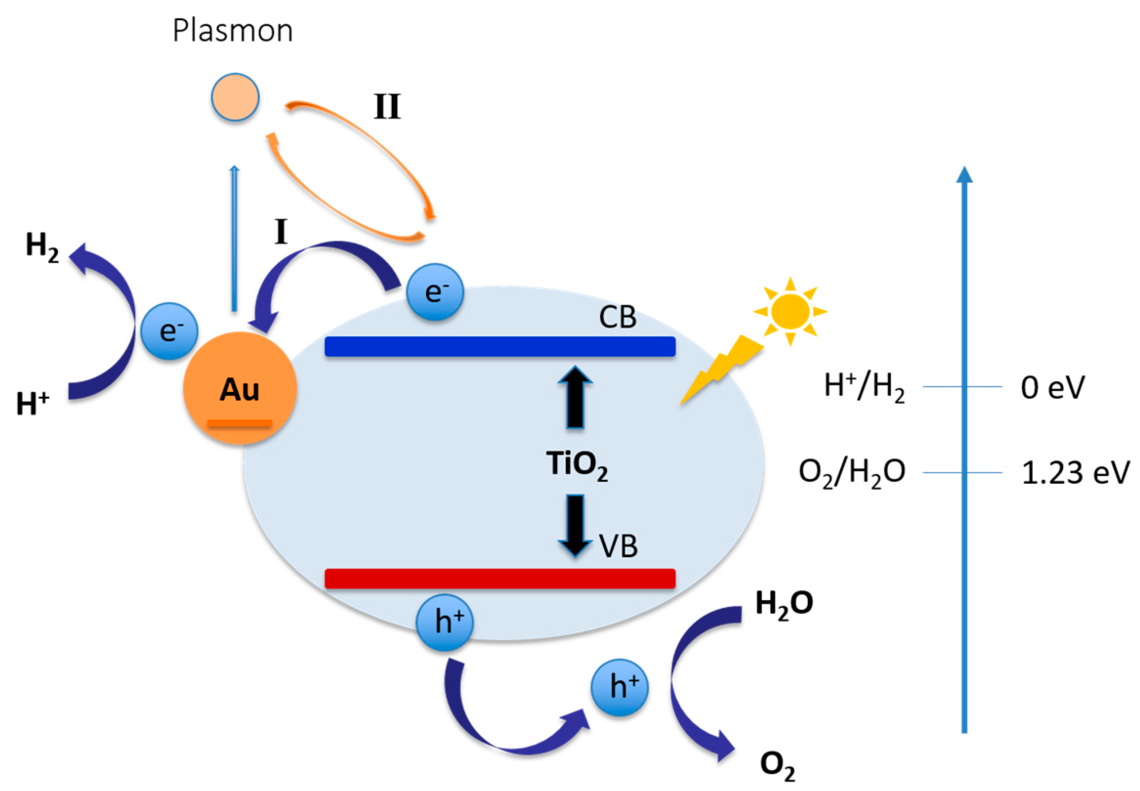 Figure 7 shows the electron transfer pathways between Au nanoparticles and TiO2 semiconductors. Another method to facilitate the photocatalytic water splitting process in the TiO2 system is by structural modification. The structure of TiO2 has a significant effect on the photocatalysis performance. Li et al. [169] have reported that amorphous TiO2 with more defects suffers from a faster charge recombination rate than high crystalline TiO2. Other than crystallinity, the mesoporous structure of TiO2 also plays a key role in the study of photo-electrode. Zheng et al. [170] have found at the existence of a mesoporous structure favors the rapid diffusion of products and suppresses the electron/hole recombination. Also, the morphology of the photocatalyst has a major effect on the photocatalytic activity [4]. 1-D TiO2 forms such as nanotubes [152], nanowires [171], and nanofibers [172] have been studied and show improved photocatalytic activity. Tuning of morphology has attracted considerable attention due to the change in material morphology that can alter charge carrier diffusion pathways. Therefore, to improve the photocatalytic hydrogen evolution efficiency of TiO2, modification of its structure is highly relevant.