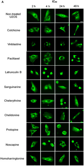 The effects of tested alkaloids on the microtubule network in U2OS cells expressing GFP-labeled tubulin. Panels show micrographs of U2OS cells treated for 2 h, 4 h, 24 h and 48 h with all ten alkaloids at concentrations of IC80 (A) and IC50 (B). The known tubulin inhibitors colchicine induced microtubule depolymerization, vinblastine caused tubulin paracrystals and paclitaxel enhanced microtubule depolymerization. Actin-binding agent latrunculin B caused the rapid change of cell morphology. Bar = 10 μm.
