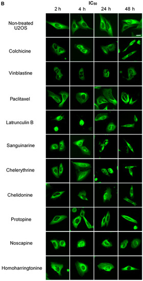 α-Tubulin-GFP U2OS cells (1 × 105) were seeded in 24-well plates and grown for 24 h. Then, 200 μL different concentrations of alkaloids (IC80, IC50) were added into each well, and the cells were imaged under a Keyence BZ-9000 microscope (Keyence, Neu-Isenburg, Germany) after incubation for 2 h, 4 h, 24 h and 48 h. The images were analyzed using BZ-II Analyzer software (version 2.1, Keyence, Neu-Isenburg, Germany).