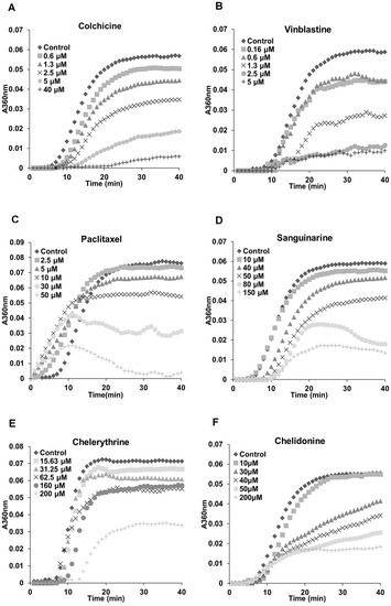 Benzophenanthridine alkaloids inhibited tubulin polymerization in vitro. Polymerization of tubulin with MAPs in the assembly buffer was measured in the absence (◆) and in the presence of different concentrations of compounds. (A,B,D–F) The inhibition of nucleation and growth phase during the microtubule assembly caused by colchicine, vinblastine, sanguinarine, chelerythrine and chelidonine. (C) A different mode of action of paclitaxel in which it accelerated the formation of nucleation and inhibited the growth phase during the assembly.