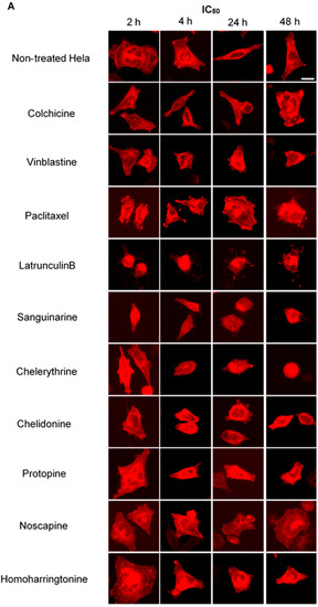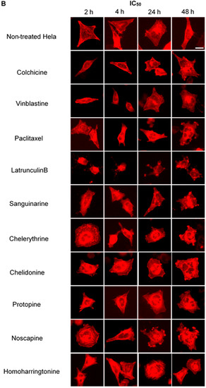 To investigate potential interactions between alkaloids and actin filaments, we visualized cellular actin filaments in Hela cells using immunofluorescence staining (Figure 3 and Figure 4) and the CellLight® Actin-RFP BacMam 2.0 system (Figure 6). We observed that only sanguinarine, chelerythrine and chelidonine affected actin filaments at a high concentration (IC80), leading to a rapid change of cell morphology and significant reduction of actin filament mass (Figure 6). No apparent changes of actin filaments were discovered in cells treated with colchicine, vinblastine, paclitaxel, noscapine, protopine or homoharringtonine.