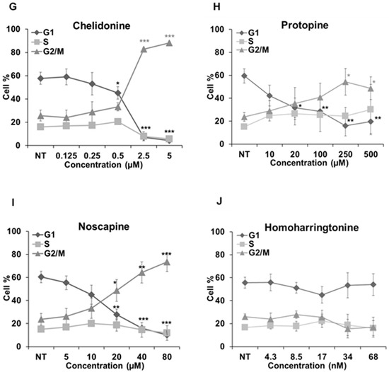 Cell cycle analysis in Hela cells. Cells were harvested after 24 h of drug treatment and subsequently assayed for their DNA content by flow cytometry. (A–D,G–I) The G2/M arrest triggered by colchicine, vinblastine, paclitaxel, latrunculin B, chelidonine, protopine and noscapine. Sanguinarine, chelerythrine and homoharringtonine did not arrest the cell cycle, which is shown in (E–J), respectively. Data are represented as the mean ± SD from three independent experiments. * p < 0.05, ** p < 0.01, *** p < 0.001.