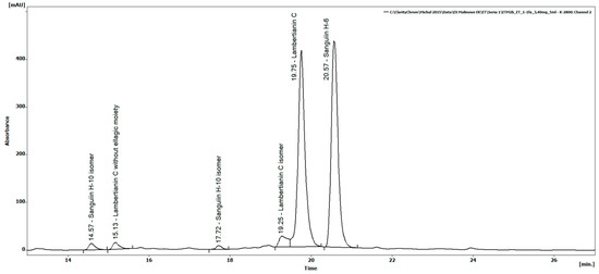 First, 3 mg of REP was dissolved in 5 mL 50% methanol and the solution was sonicated for 5 min. Subsequently, the solution was diluted with mobile phase A at a ratio of 1:1 (v/v), centrifuged at 15,000× g (MPW-260R centrifuge; Med. Instruments, Warsaw, Poland) and transferred into a vial. The content of ellagitannins was determined using a Smartline chromatograph (Knauer, Berlin Germany), composed of a degasser (Manager 5000), two pumps (P1000), an autosampler (3950), a thermostat, and a PDA detector (2800). Ellagitannins were separated on a 250 mm × 4.6 mm i.d., 5 µm Gemini C18 110A column (Phenomenex, Torrance, CA, USA) by gradient elution with 0.05% (v/v) phosphoric acid:water (solvent A) and 83:17 (v/v) acetonitrile:water with 0.05% phosphoric acid (solvent B). The column temperature was set to 35 °C, the flow rate was 1.25 mL/min, and the gradient program was as follows: 0–5 min 5% (v/v) B; 5–10 min 5%–15% (v/v) B; 10–35 min 15%–40% (v/v) B; 35–40 min 40%–73% (v/v) B; 40–44 min 73% (v/v) B; 44–46 min 73%–5% (v/v) B; 46–54 min, 5% (v/v) B. The injection volume was 20 μL. Data were collected using ClarityChrom v. 3.0.5.505 software (Knauer). Ellagitannins were detected at 250 nm, and standard curves for lambertianin C and sanguiin H-6 were used for quantification. The sanguiin H-6 curve was used for the quantification of sanguiin H-10 isomers. The lambertianin C curve was used for the quantification of lambertianin C derivatives.