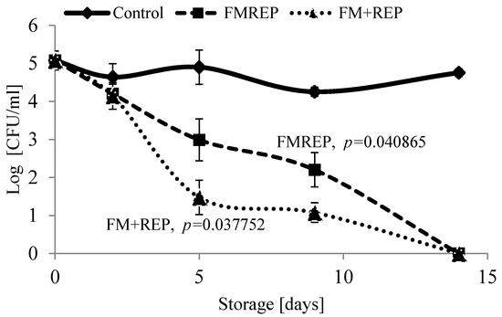 Effect of ellagitannins (10 mg/mL REP) on Geotrichum candidum viability in fermented milk during refrigerated storage (4 °C). FMREP: milk fermented with ellagitannins, FM + REP: ellagitannins added after completed fermentation.