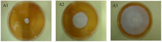 where T—linear growth rate, A—mean fungal colony diameter in mm, D—duration of experiment, b1…bn—colony diameter growth in mm, d1…dn—number of days since the last measurement.