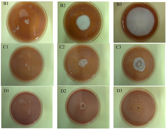 Geotrichum candidum growth on a solid medium supplemented with ellagitannins (REP) (A) Control: 1: after 1 day of incubation, 2: after 3 days of incubation, 3: after 6 days of incubation; (B) 1.0 mg/mL REP: 1: after 1 day of incubation, 2: after 3 days of incubation, 3: after 6 days of incubation; (C) 5.0 mg/mL REP: 1: after 1 day of incubation, 2: after 3 days of incubation, 3: after 6 days of incubation; (D) 10.0 mg/mL REP: 1: after 1 day of incubation, 2: after 3 days of incubation, 3: after 6 days of incubation.