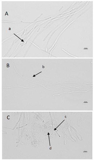 Microscopic slides with living G. candidum cells cultured in the presence of 5 mg/mL and 10 mg/mL REP were made (see Figure 3). In the control sample, the hyphae were straight with rounded tips, septa were visible, and arthrospores were present (Figure 4A-a). The microscopic slide prepared from G. candidum cultured on a medium containing 5.0 mg/mL REP did not reveal arthrospores, and the hyphae were contorted with rounded tips. Furthermore, the hyphae were deformed due to dehydration (Figure 4B-b). Finally, microscopic examination of the G. candidum culture supplemented with 10.0 mg/mL REP revealed substantial in the morphology of the fungus. The hyphal tips were forked (Figure 4C-c), in contrast to the controls. Cell lysis was observed and no arthrospores were detected. As can be seen, ellagitannin preparation obtained from red raspberry fruit prevented spore formation in G. candidum ŁOCK 0511 and altered hyphal morphology leading to cell wall disorganization and leakage of cytoplasmic material from the hyphae.
