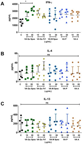 VA Qu Spez-educated DCs significantly induce the secretion of Th1 cytokine IFN-γ in DC-CD4+ T co-cultures. Immature DCs were treated with medium alone (control, labelled as ‘C’) or with five preparations of VA for 48 h. These DCs were co-cultured with CD4+ T cells for five days. Amount (pg/mL, mean ± SEM, five independent donors) of secretion of (A) IFN-γ; (B) IL-4; (C) IL-13; and (D) IL-17A in the cell-free supernatants from the above co-cultures was presented. * p < 0.05.