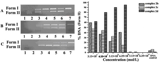 Histograms and electropherograms (the right side figure) representing cleavage of pUC19 plasmid DNA (0.008 µg/µL) by different concentrations of 2b (pH = 7.4), 2c (pH = 7.4) and 2d (pH = 7.4) in buffer (5 mM Tris-HCl/10 mM NaCl) at 37°C for 6 h. (A) Complex 2b; Lanes 1–6: 6.25 × 10−5, 3.13 × 10−5, 6.25 × 10−6, 3.13 × 10−6, 6.25 × 10−7, 3.13 × 10−7 mol/L, Lane 7 = DNA control, respectively; (B) Complex 2c; Lanes 1–6: 6.25 × 10−5, 3.13 × 10−5, 6.25 × 10−6, 3.13 × 10−6, 6.25 × 10−7, 3.13 × 10−7 mol/L, Lane 7 = DNA control, respectively; (C) Complex 2d; Lanes 1–6: 6.25 × 10−5, 3.13 × 10−5, 6.25 × 10−6, 3.13 × 10−6, 6.25 × 10−7, 3.13 × 10−7 mol/L, Lane 7 = DNA control, respectively.