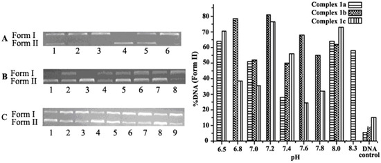 Histograms and electropherograms (the right side figure) representing cleavage of pUC19 plasmid DNA (0.008 µg/µL) in different pH buffer of 1a (6.25 × 10−7 mol/L), 1b (3.13 × 10−6 mol/L) and 1c (6.25 × 10−7 mol/L) (5 mM Tris-HCl/10 mM NaCl) at 37 °C for 6 h. (A) Complex 1a; Lanes 1−5: pH = 6.5, 7.0, 7.4, 8.0, 8.3, Lane 6 = DNA control, respectively; (B) Complex 1b; Lanes 1–7: pH = 6.8, 7.0, 7.2, 7.4, 7.6, 7.8, 8.0; Lane 8 = DNA control, respectively; (C) Complex 1c; Lanes 1–8: pH = 6.5, 6.8, 7.0, 7.2, 7.4, 7.6, 7.8, 8.0; Lane 9 = DNA control, respectively.