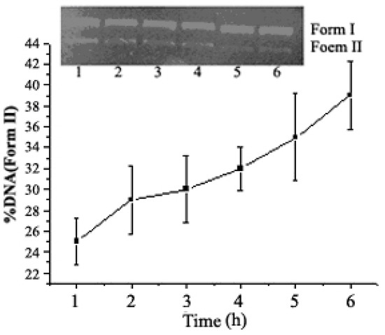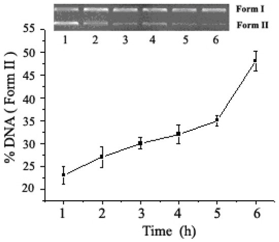 Time course of pUC19 DNA (0.008 µg/µL) cleavage promoted by 2b (3.13 × 10−7 mol/L) in pH = 7.4 buffers (5 mM Tris-HCl/10 mM NaCl) at 37 °C. Lanes 1–6, reaction time 6, 5, 4, 3, 2, 1 h, respectively.