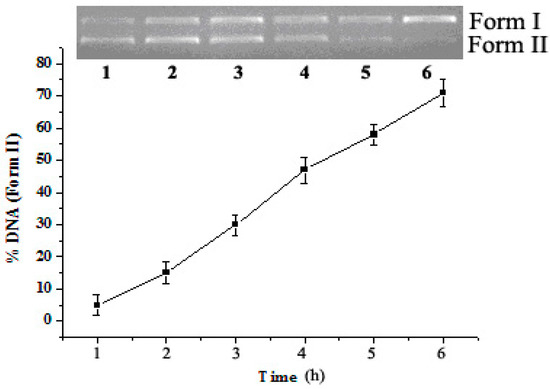 Time course of pUC19 DNA (0.008 µg/µL) cleavage promoted by 2c (3.13 × 10−7 mol/L) in pH = 6.0 buffers (5 mM Tris-HCl/10 mM NaCl) at 37 °C. Lanes 1–6, 6, 5, 4, 3, 2, 1 h reaction time, respectively.