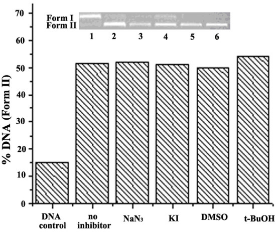 Histograms representing cleavage of pUC19 plasmid DNA (0.008 µg/µL) by compound 2a typical radical scavengers (6.25 × 10−7 mol/L, pH = 7.4). Lane 1: DNA control, Lane 2: no inhibitor, Lane 3: NaN3, Lane 4: KI, Lane 5: DMSO, Lane 6: t-BuOH.