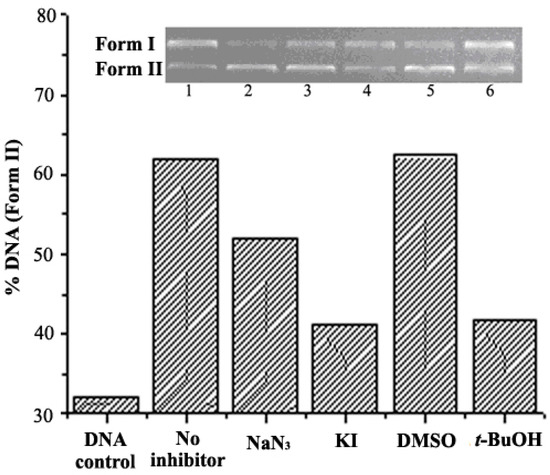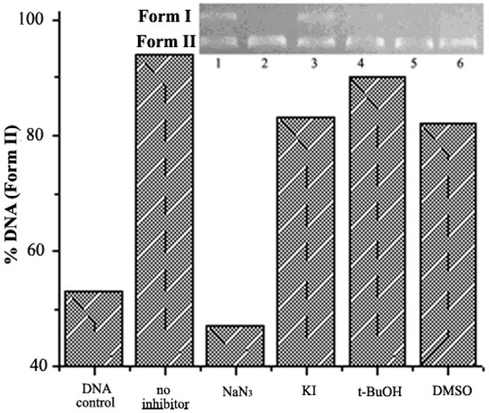 Histograms representing cleavage of pUC19 plasmid DNA (0.008 µg/µL) by compound 1b typical radical scavengers (3.13 × 10−4 mol/L, pH = 7.4). Lane 1: DNA control, Lane 2: no inhibitor, Lane 3: NaN3, Lane 4: KI, Lane 5: t-BuOH, Lane 6: DMSO.