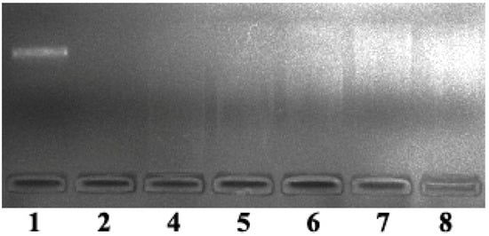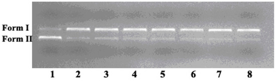 Electropherograms representing cleavage of pUC19 plasmid DNA (0.008 µg/µL) in buffer of different weight ratios of GO to complex 2c (6.25 × 10−7 mol/L, 5 mM Tris-HCl/10 mM NaCl, pH = 6.0) at 37 °C for 8 h. Lanes 1–7: complex 2c alone, 0.5, 1.0, 2.0, 3.0, 4.0, 5.0, respectively and Lane 8 is DNA control with GO (0.67 μg/μL), respectively.