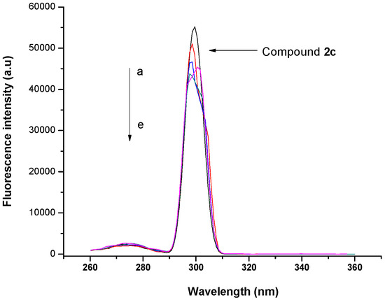 Emission spectra a–e the target material 2c (1 × 10−5 mol/L in 5 mM Tris, 50 mM NaCl, pH = 7.4 buffer with increasing GO concentration (from 0 to 6.68 × 10−5 mg/mL).